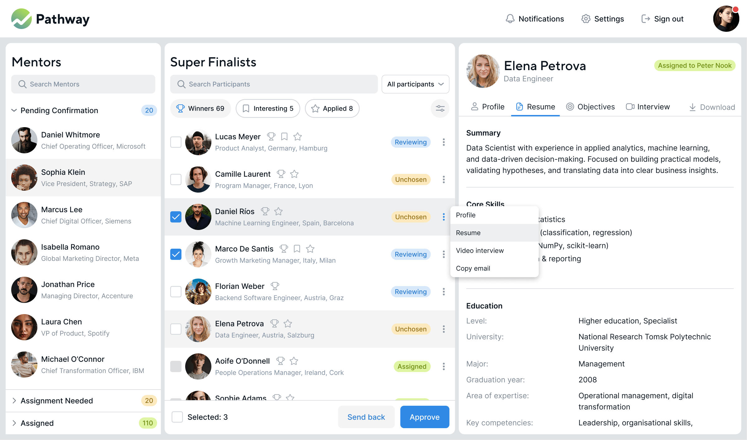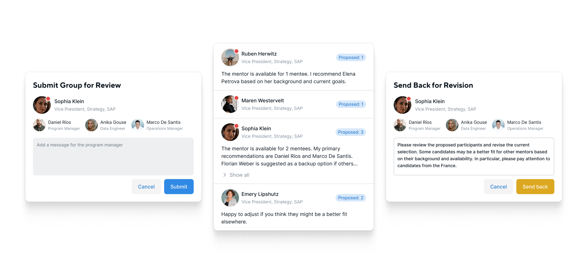 I developed a clear flow for the most complex process — matching mentors and participants — and customized the interface for each user role.